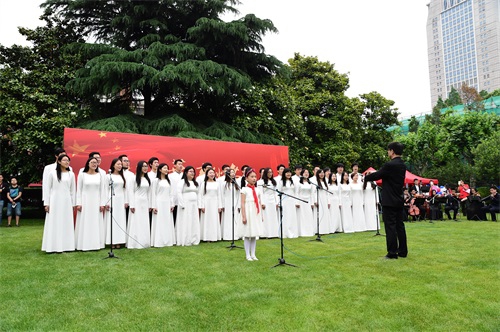 最后,在2005年出生的复旦附小学生代表陶一苇的领唱和校弦乐团的伴奏下,复旦大学合唱团和全场师生齐唱复旦校歌,升旗仪式在高亢的校歌声中结束。作育国士,恢廓学风,日月光华,春秋无止,百十年的复旦屹立东南,在全球校友的牵挂与祝福中迎来了她的生日庆典。