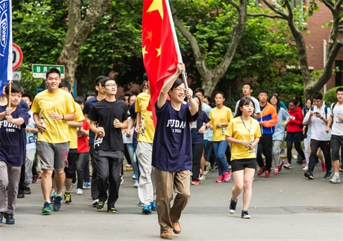 7点整,国旗班从传旗接力的最后一棒——法学院王伟老师手中接过鲜艳的五星红旗。本次升旗仪式首次融入传旗环节,共有20名来自文、理、医、工各院系的师生代表在100余位学生护旗手的簇拥下绕学校一周传国旗、校旗,经过毛主席像、曦园、相辉堂等建筑,象征百年复旦的辉煌荣光与祖国共辉映。