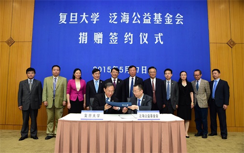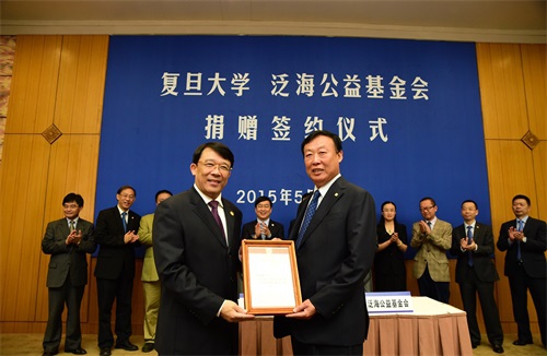 仪式上,复旦大学副校长、复旦大学教育发展基金会法定代表人冯晓源与泛海集团执行董事、泛海公益基金会理事余政代表双方签署了捐赠协议。复旦大学党委书记朱之文向中国泛海控股集团有限公司监事会主席卢志壮先生颁发了捐赠证书。