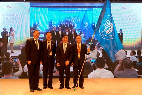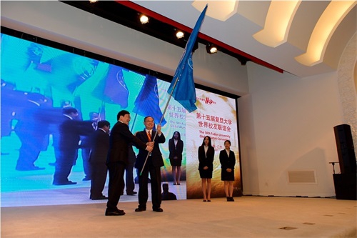 世联会接近尾声,主持人曹景行宣布广州校友会成为第十五届复旦大学世界校友联谊会承办校友会。在全体与会校友的共同见证下,本届世联会承办校友会会长许宁生、彭裕文将世联会会旗郑重交付广州校友会会长舒元。