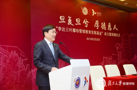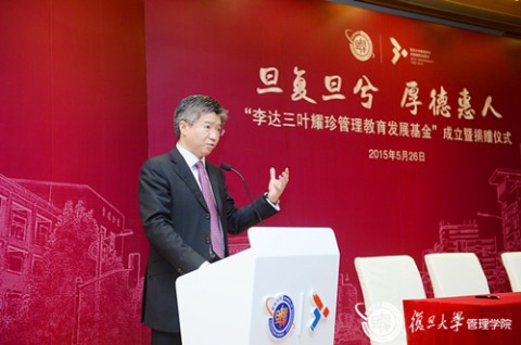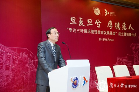 仪式上,许宁生校长首先发表了致辞。他回顾了李达三校友与复旦大学七十多年的不解之缘,对于李达三先生对于教育事业做出的卓越贡献表达了诚挚的敬意和衷心的感谢。“对于母校的建设与发展,李先生更是予以了长期的关心和支持,为母校的发展倾注了一腔赤诚,至2014年底,李先生夫妇已累计为复旦大学捐赠达人民币近3000万元。本次捐款是复旦大学有史以来收到的最大一笔校友捐款,而且一次性到账。在此我代表复旦大学向李达三先生、叶耀珍女士致以崇高的敬意和诚挚的谢忱!李先生是复旦之光、校友楷模!”他号召每一位复旦人,向李先生夫妇学习,发挥复旦人“团结、奉献、牺牲”的精神,为母校新百年的辉煌贡献智慧与力量。最后,许校长表示,“110周年象征着一个新的起点,在这个起点上,复旦大学将以更加昂扬的姿态,更加进取的精神,向着世界一流大学的道路迈进。管理学院也将继续努力,发奋图强,跻身世界一流商学院之列。”