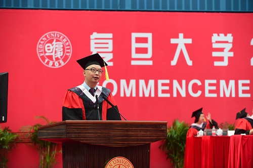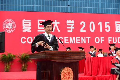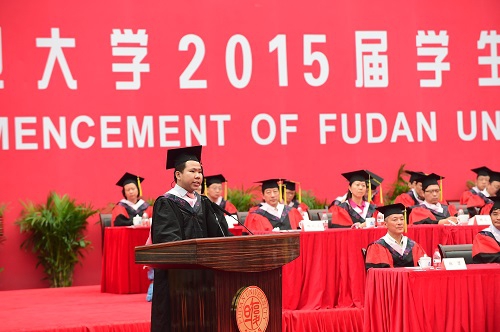 哲学学院院长孙向晨教授作为教师代表在典礼上向2015届毕业生寄语,他与同学们分享了自己为人、为师、为学的感悟,并以“敢于面对自己”和“敢于坚持自己”勉励所有同学坚持理想,成就梦想。来自新疆的校友代表玛依努尔•尼牙孜向毕业生寄语,她深情地回顾了自己在原上海医科大求学的日子,用自己潜心、刻苦钻研的经历鼓励同学们心系国家,把个人发展与社会需求相结合,保持奋斗精神,实现自我发展。环境科学与工程系毕业生赵政代表中国学生发言,他深情感谢母校,承诺复旦人将继承和发扬复旦精神,在不同的方向上努力走好属于自己的每一步,始终勤奋学习、卓越进取,以实际行动回报国家和社会。来自印度尼西亚的邓灯炮同学代表全体留学生感谢复旦,这里的广阔平台让同学们有机会参与各项活动,提高能力。他为成为一名复旦人感到无比骄傲,立志为复旦增添光辉!