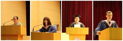 家属代表王汝杰女士和2015届本科生吴悦晨、研究生阳柱林、留学生冷弦瑞依次发言,他们回顾了毕业生在复旦的成长、成才之路,感谢给位老师对毕业生的帮助,并表示无论走多远都不会忘记家、忘记母校。