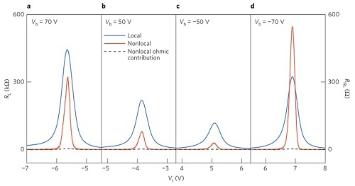 双层和单层石墨烯中准自旋流这一概念于2007年由肖笛、姚望和牛谦提出,肖笛和姚望也是这次发表的论文的合作者。张远波教授所带领的团队在实验上取得了突破,实现了双层石墨烯中准自旋的调控。据论文第一作者,现工作于牛津仪器的我校物理系校友眭孟乔介绍,虽然在单层和双层石墨烯中均可以观测到谷自旋的输运,但是破坏单层石墨烯的空间反演对称性要求破坏AB格子的对称性,难度极大且难以调控。因此他们在实验中利用顶栅和背栅的栅极电压建立垂直的电场,破坏了双层石墨烯的空间反演对称性,通过非局域的电学测量方法实现了对谷自旋的探测,并且最终实现了可由外电场调控的谷自旋信号观测。