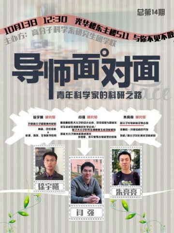 10月13日中午,由高分子科学系研究生团学联主办的第十四期“导师面对面”座谈会在光华楼东主楼511顺利进行。本次座谈会的主题是“80后青年科学家的科研之路”。本次座谈会特邀我系2015年最近引进的三位青年教师徐宇曦、闫强以及朱亮亮老师,与同学们进行了面对面的交谈。系党委副书记朱莹出席当天活动,座谈会由高分子科学系14、15级硕士研究生辅导员谢可可主持,我系研究生、本科生等60多名同学济济一堂,共同参加了当天的座谈会。