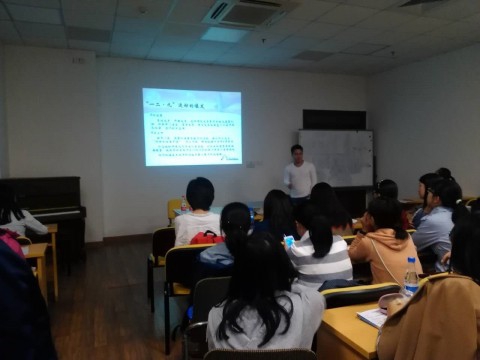 动员结束之后,第一次排练正式开始。合唱指导桂俊杰老师诙谐幽默、功底扎实,一开始就将同学们的训练热情调动起来。在进行了一些简单的音阶训练之后,初步帮助同学们找到了合唱状态,并对同学们的发音问题进行了纠正。随后桂老师便带着同学们学习演唱初步选定的曲目《在灿烂的阳光下》。排练过程中同学们的训练热情高涨,原定于八点半结束的合唱训练,直到八点五十才结束,同学们仍意犹未尽。