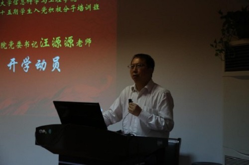 最后,信息学院党委书记汪源源老师向学员们作了开班动员。汪书记回忆了自己入党时的种种往事,鼓励同学们将理论学习与实践活动相结合,严格按照课程安排、不折不扣完成党校培训班的学习。此外,汪书记特别强调了党校联系人的桥梁纽带作用,希望联系人做好传达与组织的工作,确保学员与党员导师、学员与党建核心组联系畅通,关注小组学习进程、巩固学习效果。