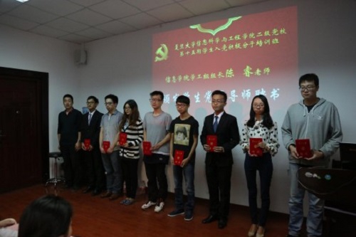 本期延续了设立“学生党员导师”的优秀传统,作为对传统党校党课实践的有机补充。通过一些入党时间较长、在党组织中表现优异的学生党员的言传身教,来帮助入党积极分子更好地了解党组织,学习如何在学习生活中进而在思想和行动上进一步向党组织靠拢。黄芳老师的课程介绍后,复旦大学特邀党建组织员朱建艺老师宣读本期培训班的党员导师名单,并由信息学院学工组组长陈睿老师向八位党员导师颁发聘书。党员导师代表李睿康同志作了发言,以一名党龄三年的学生党员的身份向积极争取入党的同学们分享了自己作为一名党员的切身感受,并表达了对积极分子同学的深切期望。