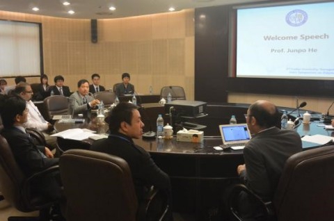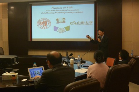 在魏大程研究员的主持下,论坛正式开幕。首先,魏大程老师对山形大学的师生表示热烈的欢迎,并一一介绍到场嘉宾。接着,何军坡教授即场致辞,欢迎山形大学师生到访,并表达了双方继续合作与交流的重要意义。随后,Takahashi教授向我校师生们介绍了山形大学工学部高分子学科的发展历程和现状,山形大学工学部是人造纤维的诞生地,随后研究功能聚合物与工程技术、有机半导体材料等,有机材料成为它的核心技术,在OLED展示与OLED发光领域占有先驱地位,最近在发展Life-3D打印创新中心及柔性全打印电子器件。山形大学所在地—山形县在日本政府的支持下成为战略国际创新促进区域,是世界主要有机电子工业集中区,区域优势使得山形大学工学部产研结合,稳健发展。Takahash教授最后引用最近中日领导人握手的图片表达了未来继续合作的意愿。