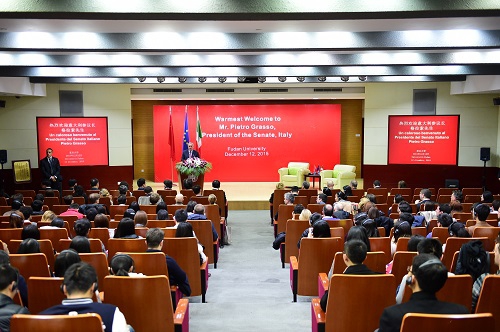 许宁生校长与格拉索先生会晤。他欢迎代表团访问复旦大学,并介绍了我校与意大利高校开展交流合作的情况。随后,格拉索先生发表了题为“哪有市民社会,哪里就有法律——中意关于传统与未来的法律对话”的演讲,并回答学生们的提问。