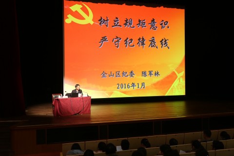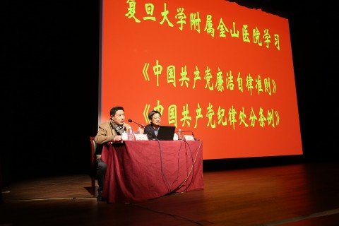 1月11日晚,金山医院在区文化馆召开全体党员专题学习会议,传达学习新修订的《中国共产党廉洁自律准则》和《中国共产党纪律处分条例》。院党政班子成员、全体党员及入党积极分子共300余人参加了会议。