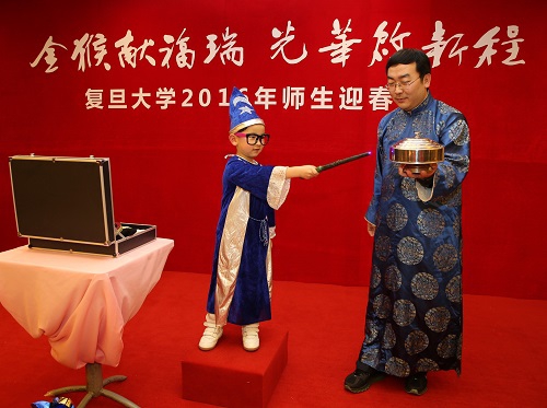 2016年1月28日、29日,“金猴献福瑞,光华启新程”——复旦大学2016年师生迎春会分别在邯郸校区及枫林校区举行。上海市委常委、统战部部长沙海林同志,市教卫工作党委副书记沈炜同志,上海市民族和宗教事务委员会副主任王新华同志,校长许宁生,常务副校长包信和,校党委副书记陈立民、袁正宏、刘承功、尹冬梅,副校长桂永浩、金力与全校1000余名留校师生欢聚一堂,辞旧迎新,共庆佳节。