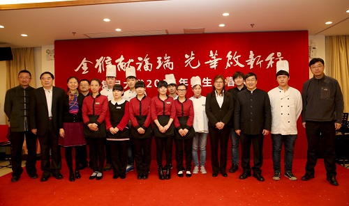 迎春会后,全体厨师和服务员们登台亮相,校领导也上台与厨师合影留念。据悉,今年春节期间,餐饮工作人员为保证留校师生的餐饮供应,仍然坚守岗。所有留校过年的学生今年仍可以凭一卡通,在除夕夜和大年初一全天至学校食堂享受较为丰盛的“一分钱爱心餐”。