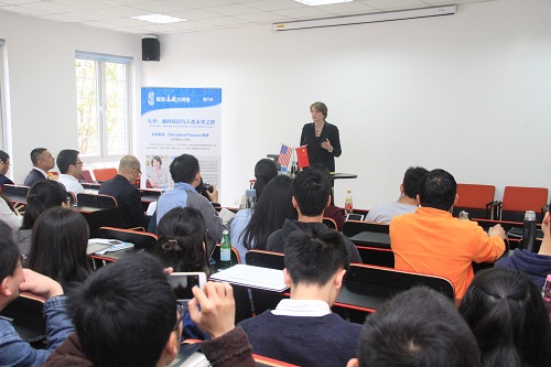 会见后,Christina Paxson校长做客“复旦通识大讲堂”,作了题为《大学:通向知识与人类未来之路》的演讲。Christina Paxson教授介绍了曾在布朗大学举行的“中国年”活动,并从“知识界的传统探索”,“综合性通识教育和参与式大学”,“与世界及其领导阶层的道德联系”,“人类的进步与知识的交流、传承和发现”等角度分享了治学、治校的感悟。