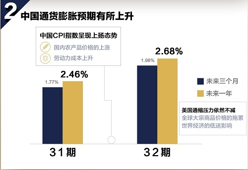 2016年的中国经济增长预期为6.62,与2月的调查数据相比,专家对2016年的中国经济增长预期上升。未来3个月中国的通胀率为2.46%,未来一年的通胀率为2.68%。孙教授指出,“受国内农产品价格的上涨和劳动力成本上升的影响,CPI指数呈现上扬态势。而美国通胀的复苏受到全球大宗商品价格的拖累,再加上世界经济的低迷影响,通缩压力依然不减” 。