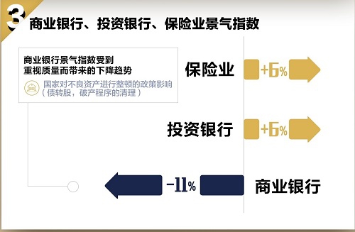 本期发布的商业银行景气指数比2月调查的景气指数下降约11个点;投资银行的景气指数上升约6个点;保险业的景气指数上升6个点。孙立坚教授认为,“商业银行景气指数受到国家对不良资产进行整顿的政策影响(债转股,破产程序的清理),银行的景气指数出现了重视质量而带来的下降趋势”