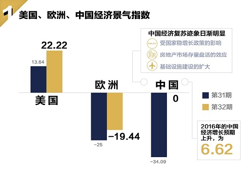 美国经济的景气指数从13.64上升至22.22,景气指数出现上升;欧元区经济的景气指数从-25变为-19.44;中国经济的景气指数由-34.09变动为0,有所上升。复旦发展研究院金融研究中心主任孙立坚教授认为,“受国家稳增长政策的影响,由房地产市场存量盘活的效应和基础设施建设的扩大所带动的中国经济复苏的迹象日渐明显。”。
