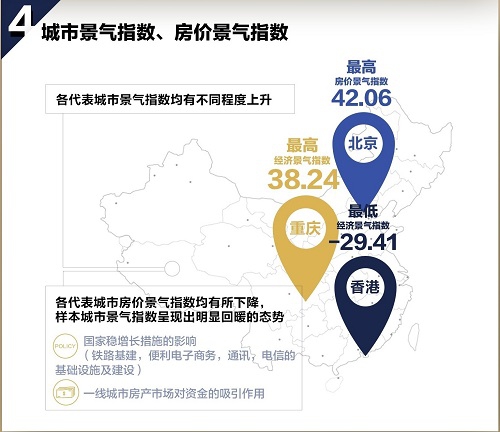 与2月调查结果相比,各代表城市景气指数均有不同程度上升。第32最高经济景气指数为重庆,为38.24;香港经济景气指数最低,为-29.41。