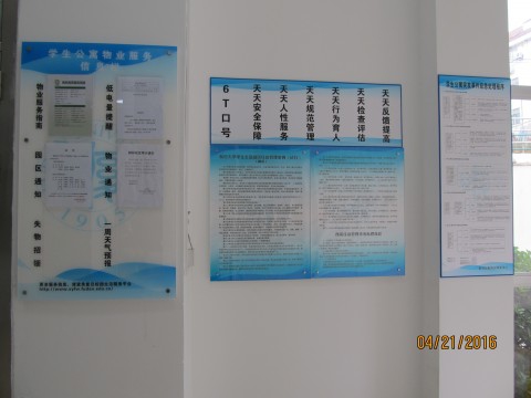 走进护理学院学生公寓大门,宽敞明亮的大厅给人舒适、温馨的感觉。放眼望去,墙面上张贴的“‘六T’管理口号”、“物业服务人员信息”、“学生公寓突发事件应急处理程序”、“学生公寓物业服务信息栏”等等KT板井然有序。