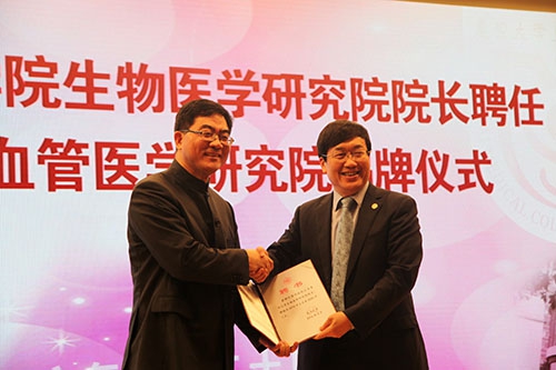 新闻中心讯 4月20日,“复旦大学生物医学研究院院长聘任暨复旦大学泛血管医学研究院揭牌仪式”在枫林校区举行。中国科学院院士、校长许宁生出席仪式,并向中国科学院院士、上海市心血管病研究所所长、我校附属中山医院心内科主任葛均波颁发“复旦大学生物医学研究院院长”聘书。