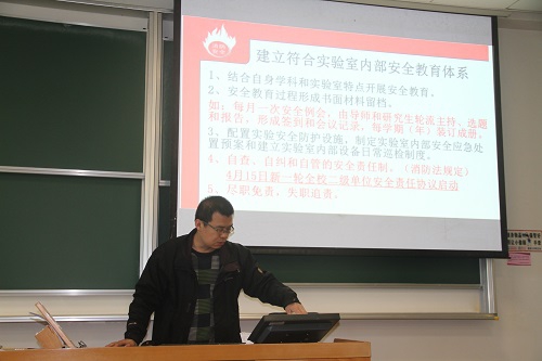学院邀请保卫处消防科李宏亮科长给全院教工作“实验室典型火灾案例和消防安全防范”培训。他通报了上海消防关于实验室典型火灾,尤其对高校实验室发生的火灾进行剖析,分析失火原因,引以为戒。4月15日学校启动新一轮全校二级单位安全责任协议,要求各院系:建立符合实验室内部安全教育体系,结合自身学科和实验室特点开展安全教育;配置实验安全防护设施,对实验室进行消防安全防范,制定实验室内部安全应急处置预案和建立实验室内部设备日常巡检制度;采取自查、自纠和自管的方式,制定尽职免责、失职追责的安全责任制。