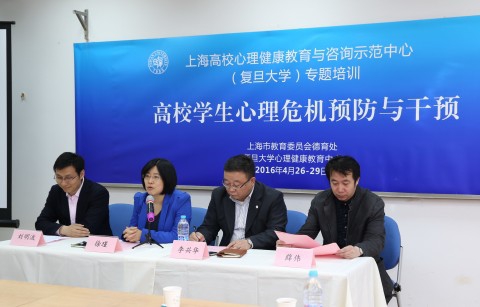 2016年4月26日上午,由我校心理健康教育中心举办的上海市高校心理健康教育与咨询示范中心(复旦大学)专题培训“高校学生心理危机预防与干预”开班仪式在叶耀珍楼302室举行,上海市教委德育处处长李兴华,我校党委学生工作部、我校心理健康教育中心相关负责人以及来自校全市大中小学的60余名参训老师出席了此次开班仪式。
