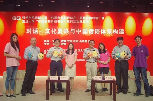 6月6日晚,我校举办“文化复兴与中国话语体系构建”对话活动。华东师范大学党委书记童世骏教授,中山大学人文高等研究院院长、博雅学院院长、通识教育总监甘阳教授,上海哲学学会会长、教育部长江学者、我校哲学学院吴晓明教授三位学者开展对话。活动由我校哲学学院院长孙向晨教授主持。本次活动由我校委研究生工作部、哲学学院联合主办,是我校“中国梦的价值引领”系列活动第5场,也是哲学学院建院(系)60周年系列活动之一。