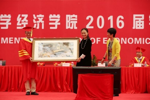 紧接着是精心安排的三个互动环节——“感师恩·立远志·校友情”。在首先进行的“感师恩”环节中,2016届国际金融系本科生王充和2016届世界经济系巴黎一大硕士生李硕两位同学作为毕业生代表向学院赠送了一份名为“OURSOE TREE”的礼物,这棵刻有“经”字的大树由全体2016届毕业生的指纹所组成,表达了枝繁叶茂的“树叶”们对“大树”无限的依恋和感恩。石磊代表经济学院赠予学生“经济学院校友徽章”、校友刊《仙舟客》和校友笔记本,并为同学们佩戴徽章,合影留念。这枚纪念徽章也象征了学院和校友之间的情谊。同时,石磊还向各班级的校友联络员颁发了证书。