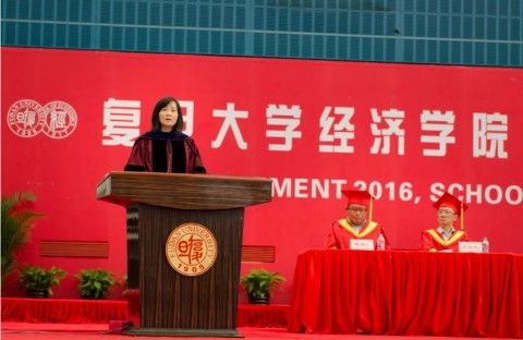 随后,经济学院校友、哥伦比亚大学商学院副院长姜纬为毕业生做毕业演讲。她表达了回归母校做毕业主题演讲的激动心情,并表示想要借此机会和毕业生们探讨如何看待成功以及肩负的使命。她说,成功的本质是稀缺性,能考入复旦已是同龄人的佼佼者,这其中离不开个人的能力和努力,但是对此要有更清醒的认识,因为成功所需要的才能和努力不仅是个人美德,也是一种顺应时代需求的禀赋,因此这份成功也相应地带来了责任和义务。顶尖学府的毕业生走上社会成为“优渥群体”,更需牢记自己的社会责任,因为社会会倾听受过良好教育群体的呼声,他们的一言一行都会成为社会的主流思潮。所以坚持人和人在人格上和法规前的平等,去实现包容多数的共享式经济增长就更显重要。姜纬在毕业时所设定的“人生底线”是任何理想追求都必须建立在个人经济独立之上,但之后的人生决策中,金钱恰不是决定性因素。她希望毕业生们能赋予成功更多元的涵义,去亲手设计属于自己的成功。