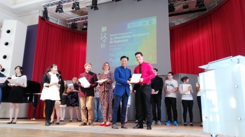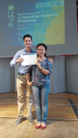 德国当地时间5月21日,来自与我校共建的法兰克福大学孔子学院选手费立志(Fiedler Fritz)在德国海德堡市参加第十五届“汉语桥”世界大学生中文比赛德国大区决赛,并荣获德国大区一等奖,今年7月将赴中国参加全球总决赛。本次大赛由孔子学院总部和中国驻德大使馆教育处主办,16位来自全德各孔子学院和大学汉学系的选手参赛。