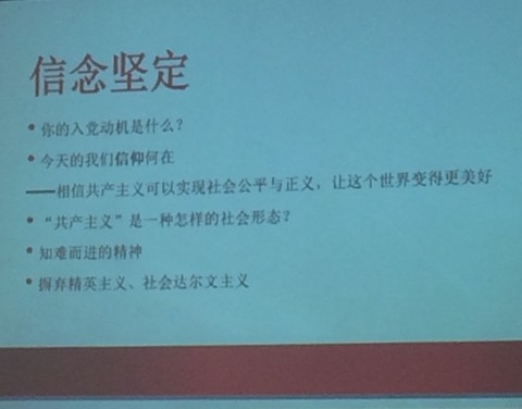接下来高雅同学向大家展示了题为《做一个信念坚定,业务水平高的共产党人》的主题教育。她将演讲内容划分为三个部分:一是坚定信念,二是业务水平高,三是落实到行动中来。首先是“坚定信念”,她谈到明确入党动机是关键因素,并且要在信念上相信共产主义可以实现社会公平和正义,使我们生存的世界更美好。接着是“业务水平高”,她鼓励大家挖掘自己的特长并使之发挥作用;最后是“落实到行动”,结合党章学习小组成员四年来的表现,她鼓励同学们更加注重细节、时刻进行自我反思;并且号召同学们摒弃精英主义,尽自己的努力给予世界更大的责任感与关怀心。在高雅同学发言完毕后,高分子科学系党委副书记朱莹老师进行了总结发言,她首先高度评价了12级党章学习小组在院系本科生党团活动中发挥的带头作用,并肯定了高雅同学在本次主题教育活动中提出的大部分建议,鼓励毕业生党员们要坚持实事求是,做一个信念坚定、正直勇敢、学会独立思考能力的人,不要轻易被外界混杂信息所干扰,在面临人生各个阶段选择的时候考虑和结合国家和社会的需要。