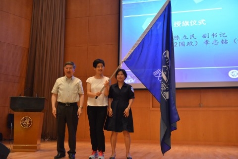 陈立民副书记向92级(97届)班级联络员代表国政系校友周广平、化学系校友李志銘传递返校会旗。