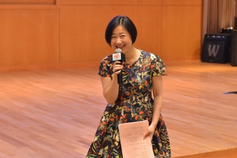 随后,91级新闻系校友何小兰、91级计算机系校友柏翔作为校友代表发表感言。何小兰回顾自己20年的职业生涯,呼吁同学们努力做最好的自己,为母校做贡献,并深情朗诵87级新闻系校友黎瑞刚原创诗歌《期待一个水晶和云母的早晨》。柏翔回忆了军训场景、复旦食堂、宿舍对酒当歌等大学生活片段,以简短的语言重温当年情,引发共鸣。