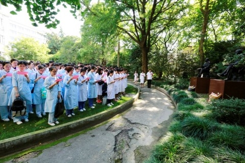 随后,新职工们至医院后花园进行庄严的宣誓仪式。首先,两位新职工代表向入选国家级人才计划的教授郭秉宽、胡懋廉的铜像敬献鲜花。接着,汪志明院长与李华书记带领新职工宣读誓词,坚定了新职工们“救死扶伤,不辞艰辛,执着追求”的信念。