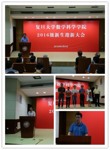 郭坤宇院长首先对新生们的到来表示热烈的欢迎。他向同学们介绍了学院光荣悠久的历史和学科发展近况,勉励新生利用各种资源勤奋学习和思考,并在大学学会懂规矩、讲规矩、守规矩,用今天的努力和投入创造美好的明天。侯力强书记宣读了2016级本科生导师和新生辅导员名单,并为导师和辅导员颁发聘书。2016级本科生导师代表王珺老师结合自己对“坚持”和“开放”两个词的理解,勉励同学们坚持学习与提高,放开心胸相互鼓励支持,并祝愿大家早日发现对数学的真爱。新生辅导员代表柴宏宇老师表示将尽心尽力做好本职工作,并和新生们携手成长,共同培养自身的复旦精神。刚刚荣获第七届丘成桐大学生数学竞赛金奖的2013级本科生张页同学和大家分享数学专业学习的体会和心得。研究生新生代表刘文豪同学则表达了对复旦学习生活的憧憬,并与同学们共勉,将自己锻炼成一个优秀的复旦数学人。