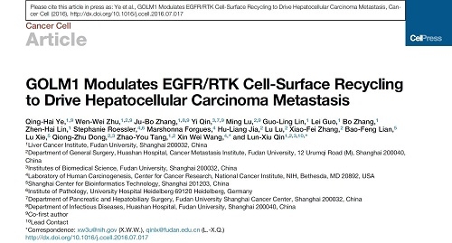 钦伦秀教授团队在采用全基因组解析肝细胞癌(HCC)转移的特异性基因时发现, GOLM1与肝癌肝内远处转移和患者不良预后密切相关,进一步机制研究发现,GOLM1促进肝癌转移进程是通过调控细胞内EGFR再循环途径实现的。