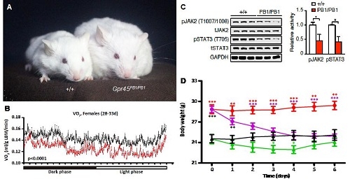 吴晓晖教授课题组对新发现的G蛋白偶联受体Gpr45基因进行了深入研究,发现神经系统特异表达的Gpr45基因失活导致小鼠代谢减缓,自离乳起肥胖,进而出现脂肪肝、胰岛素抵抗、血糖增高等代谢异常。GPR45在下丘脑通过JAK/STAT信号通路调控能量代谢信号分子POMC的表达,Gpr45突变导致POMC表达量和POMC神经元活性降低,脑室注射POMC产物类似物MTII则可抑制Gpr45突变小鼠的肥胖(图2)。