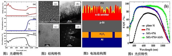课题组通过在p型单晶Si(100)(110.2 mm3)上扩散磷制备pn结,利用化学刻蚀方法在n型发射极中形成多孔黑硅,其紫外可见光范围反射率低于0.3%(图1)。黑硅由Si纳米晶组成(图2),其中黑硅表面由SiO2钝化,背面由Al2O3钝化,顶电极用ITO,背电极用Al,从而构筑出太阳电池(图3)。与平面晶硅电池相比,这种黑硅电池具有宽谱特性(图4),其光电转换效率高达18.97%。由于硅纳米晶带隙高于晶硅,因此该黑硅电池的开路电压高于相应的平面硅电池,而且,发射极的梯度带隙结构抑制了前表面电子和空穴的复合。另外,由于短波长范围吸收度高,短波长处的光伏响应也较好。因为采用了背面场效应钝化,抑制了背面区域长波长光激发产生的电子和空穴的复合,使得长波长处的光伏响应显著提升。未来可通过提升开路电压和增强填充因子,进一步提升该黑硅电池的效率。
