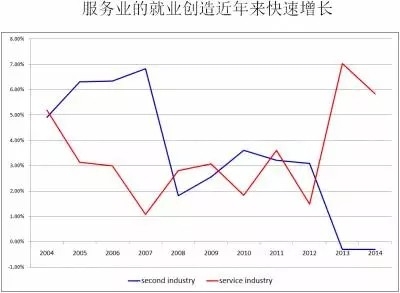我的同事章元教授根据国家统计局的数据进行测算的结果显示,三个产业的就业在这几年发生了变化,能够发现经济结构的变化非常明显,在2010年的前后五年,制造业和服务业吸收的就业人口被倒过来了:制造业创造的就业明显在下降,而服务业创造的就业明显在上升。