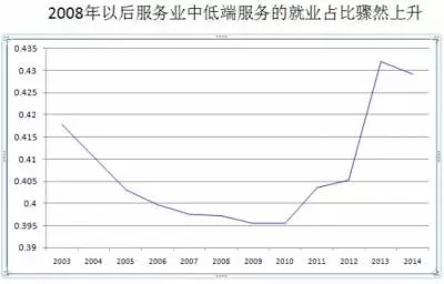 服务业超过制造业,开始提供大量的就业,但是服务业的口径很宽泛,不同的服务业品类,附加值的差异非常非常大。而中国目前的情况是,中低端服务业的就业占比骤然上升。