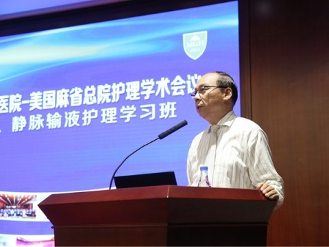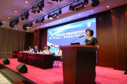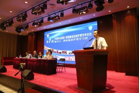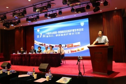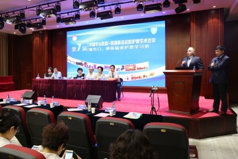 日前,第七届“中国华山医院-美国麻省总院护理国际论坛暨伤口、静脉输液护理学习班”在复旦大学附属华山医院举行。华山医院副院长马昕主持开幕式。上海市卫计委科教处处长张勘、医政医管处副处长吴宏、上海市护理学会第十届理事长翁素贞以及华山医院副院长邵建华出席论坛并致辞。美国麻省总院(MGH)护理部副主任Kevin Bruce Whitney带来了4000多位护理同行的问候。全国各大医院护理管理者、临床护理专家和华山医院护理人员200余人参会。