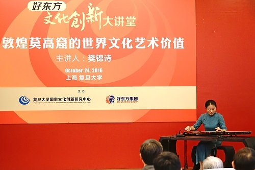 10月24日下午,由复旦大学国家文化创新研究中心、江苏好东方集团主办的“好东方文化创新大讲堂”在复旦大学新闻学院蔡冠深报告厅进行了首场演讲。现场数百位师生共同聆听了中央文史馆馆员、敦煌研究院名誉院长樊锦诗的精彩学术演讲《敦煌莫高窟的世界文化艺术价值》,并与其互动交流。讲座由复旦大学国家文化创新研究中心主任、复旦大学新闻学院教授孟建主持。广陵琴派传人、江苏古琴艺术“非遗”传承人应邀来到现场演奏古琴曲。