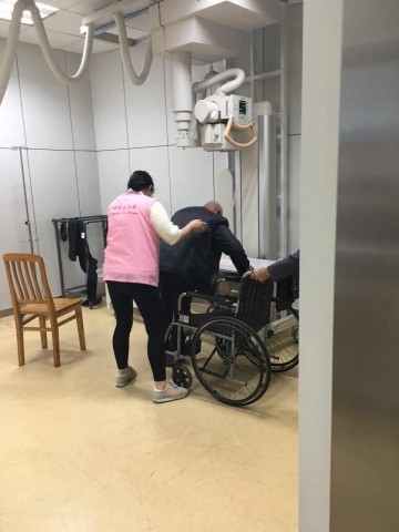 10月12日8:00,志愿者在住院部一楼大厅集结完毕,身着“上海市南丁格尔志愿护理服务队”粉红色志愿者马甲,深入医院各处,走近患者身边。她们中有陪着急诊患者挂号、拍片、补液的,也有陪着老年患者就诊抽血的。有的志愿者陪伴平诊患者收治入院,一个上午的时间,每名志愿者陪伴2-3个病人完成了就诊过程。