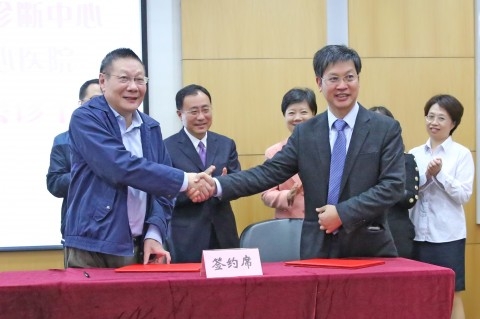 复旦大学上海医学院副院长、复旦大学附属闵行区中心医院(筹)院长夏景林与上海复旦临床病理诊断中心主任施达仁代表双方签约。