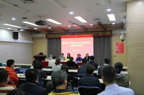 11月14日中午,徐汇区第138选区正式代表候选人与选民见面会在中山医院2号楼三楼中山大讲堂举行。汪昕、葛圣金两名正式代表候选人向来到现场的百余名代表表态,如果当选为人大代表,将如何履行好代表职责。