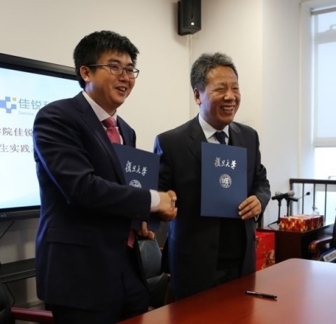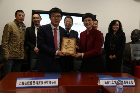 11月17日下午,复旦大学数学科学学院“佳锐助学金”捐赠暨专业硕士学位研究生实践基地签约仪式在光华楼举行。上海佳锐信息科技有限公司董事长杨雪松、总裁李俊明等公司负责人与复旦大学对外联络处处长、复旦教育发展基金会秘书长潘俊等外联处负责人出席捐赠和签约仪式,数学科学学院院长郭坤宇、党委书记侯力强及受助学生代表共同参加,仪式由学院党委副书记张晓清主持。
