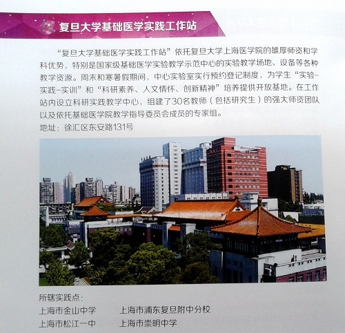 “复旦大学基础医学实践工作站”依托复旦大学上海医学院的雄厚师资和学科优势,特别是国家级基础医学实验教学示范中心的实验教学场地、设备等各种教学资源,开展一系列科学创新活动。在周末和寒暑假期间,中心实验室实行预约登记制度,为学生“实验-实践-实训”和“科研素养、人文情怀、创新精神”培养提供开放基地。在实践工作站内设立科研实践教学中心,组建实力雄厚的师资团队以及依托复旦大学基础医学院教学指导委员会成员的专家组。