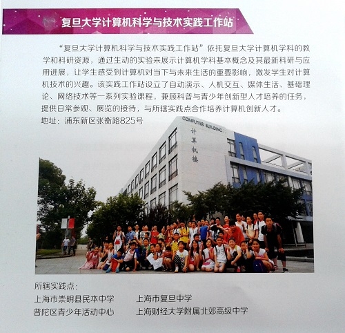 “复旦大学计算机科学与技术实践工作站”依托复旦大学计算机学科的教学和科研资源,通过生动的实验来展示计算机学科基本概念及其最新科研与应用进展,让学生感受到计算机对当下与未来生活的重要影响,激发学生对计算机技术的兴趣。该实践工作站设立了自动演示、人机交互、媒体生活、基础理论、网络技术等一系列实验课程,兼顾科普与青少年创新型人才培养的任务,提供日常参观、展览的接待,与所辖实践点合作培养计算机人才。