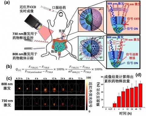 图1. (a)红外成像分析用于活体药物释放监控;使用808 nm和730 nm两束不同的近红外激光来分别实现口服给药后药物载体在活体内运动轨迹的监测和药物载体在肠道药物释放的定量监测;(b)药物释放量数学计算公式;(c)活体成像分析结果;(d)由c图中成像结果提取的数值结合b图中的数学计算得出的不同时间药物释放量。