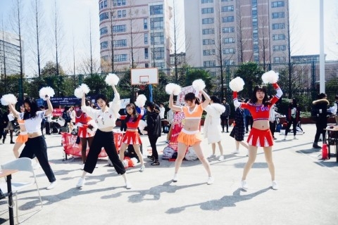 相邻的音乐剧社和吉他社虽然同时使用音响,不但没有发生争执,还通力合作为同学们带来了极具艺术感染力的表演,围观的许多同学不禁拿出手机记录精彩的瞬间;复旦大学啦啦队的姑娘们也用起了啦啦操的道具,在冬日的寒风中尽情释放青春的活力。